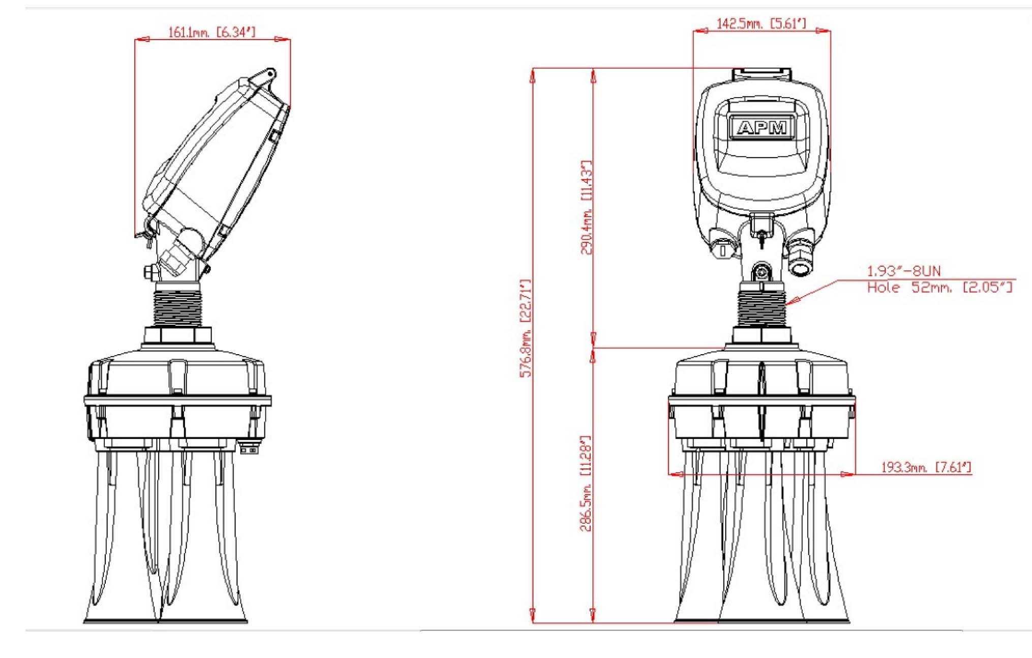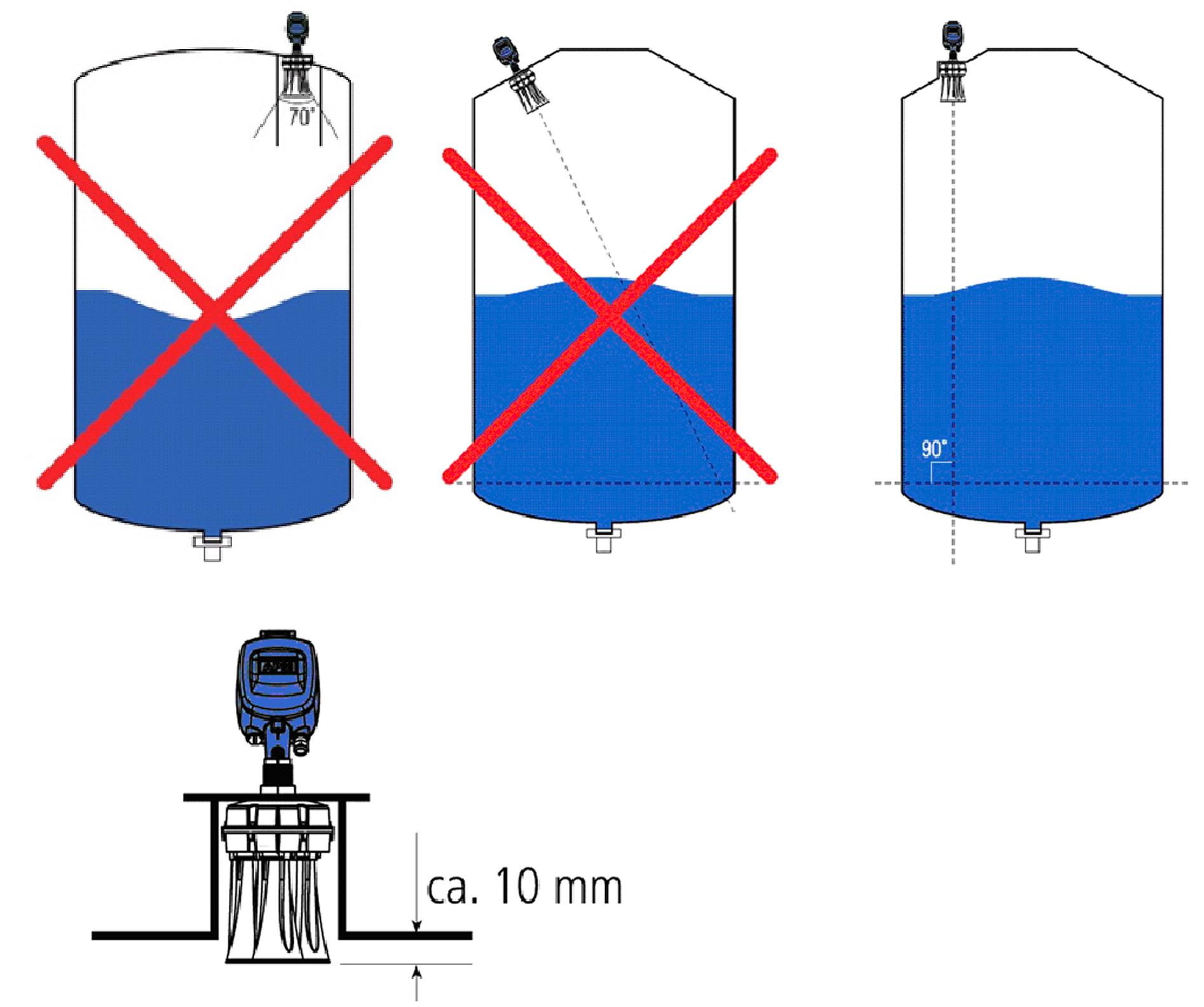 正確的安裝位置為:離罐壁距離為罐直徑1/6處,最小距離為500mm。 不可安裝在入料口上方。 盡可能避免罐內障礙物,如開關,儀表,加熱線圈,真空環(huán)和擋板等等 喇叭口進入料倉不小于10mm 必須垂直安裝于料倉 |